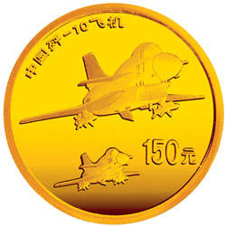 中国 - 中国歼-10飞机1/3盎司纪念金币 正面图案:中华人民共和国国徽,并刊国名、年号。背面图案:中国歼-10飞机编队飞翔图,并刊“中国歼-10飞机”字样及面额。1/3盎司圆形金质纪念币为精制币,含纯金1/3盎司,直径23毫米,面额150元,成色99.9%,最大发行量10000枚。 铸造单位: