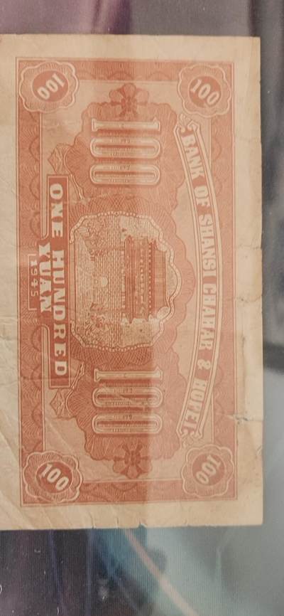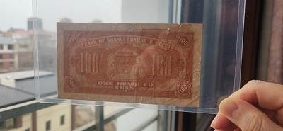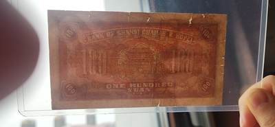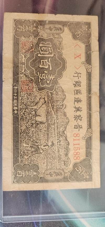 这是一张晋察冀边区银行民国三十四年(1945年)壹百圆纸币,正面为“马拉犁地”农耕图,背面为英文行名“BANK OF SHANSI CHAHAR & HOPEI”及建筑图案,冠号 811588。纸币为流通旧品,原票无下水、无修补,纸张为边区自制土麻纸,纤维感明显,自然泛黄,有明显流通折痕,边角有轻微磨损与小裂口,无大面积缺损,图案与文字清晰完整,墨色深沉,底纹细密。恳请专家鉴定:是否为真品(原票),有无修补、下水、裁切等处理,并评估综合品相与市场参考价值。