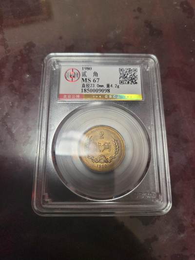 1980年2角长城币(公博 MS67)核心数据 - 发行量:约 248万枚(流通年份里第二少,仅多于83年55万) - 存世量:原光好品不足 5%,MS67分以上千分之一级别,非常少见 - 材质成分:铜70%、锌30% 铜锌合金(黄铜),金黄色、成本高、易氧化难保存 - 面值特殊性:中国唯一一枚贰角面值硬币,只此一版、后无再发 - MS67稀有性:公博MS67属未流通顶级品相,底板干净、原光足,80年2角里百里挑一。