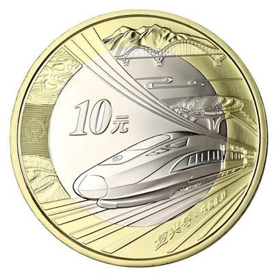 中国高铁普通纪念币 中国高铁普通纪念币是中国人民银行于2018年9月3日发行的一枚普通纪念币。该纪念币面额10元,直径27毫米,材质为双金属铜合金,发行数量为2亿枚,与现行流通人民币职能相同,与同面额人民币等值流通。 该纪念币正面图案为中华人民共和国国徽,并刊国名、年号;背面图案主景为“复兴号”动车组,主景上方刊有面额“10元”字样