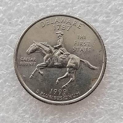 该州图案上有邦联雕像,该州轮廓、铭言(Virtue, Liberty, Independence)“美德,自由,独立”和一块冠石。这幅图案使人民能进一步了解1787年12月1日成立的美国第二个州的起源。由纽约雕刻家罗兰•辛顿•佩里(RolandHinton Perry) 雕刻的邦联雕像,是一座高为 14.6米的镀铜女性像。