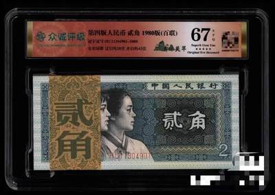第四套人民币贰角错版 1980年发行 数字移位早期冠青绿美翠 原始漏印 69分评级 带二维码防伪 10张连号 AX67863031-AX67863040 正背面胶印 原条现拆绝品 带评级证书