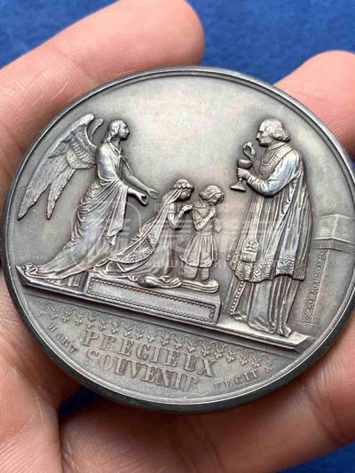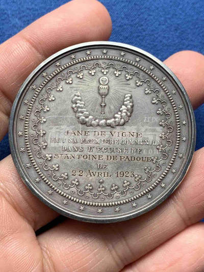 1923年法国第一次圣餐纪念银章,由Hart雕刻。正面刻画天使见证神父为孩童施圣餐的场景;背面以圣餐杯为中心,刻有受礼人Jane de Vigne、教堂名及1923年4月22日的受礼日期。