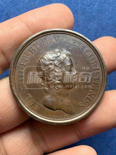 1646年法国路易十四时期铜章。正面为路易十四右侧胸像;背面为胜利女神,纪念法军攻占库尔特拉科等城。