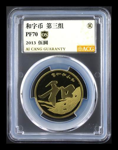 “和”字书法行书精制纪念币(2013年),由中国人民银行发行,面额5元,直径30毫米,材质为黄铜合金,重12.8克,发行量10万枚。精制币工艺更精细、镜面效果更强。