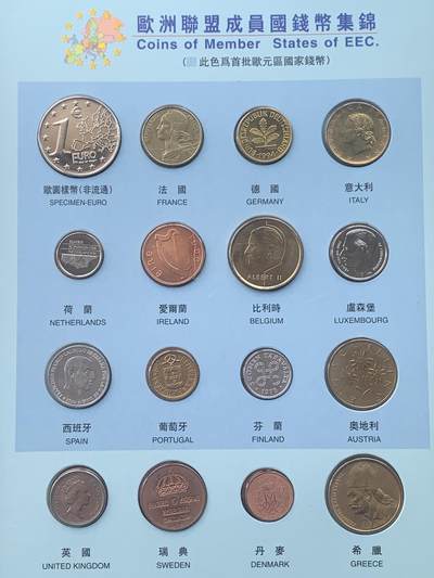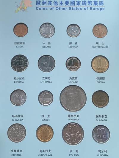 欧洲钱币集锦:欧盟成员国钱币,含首批欧元区国家(法、德、意等)及英、瑞、俄、乌等非欧盟国家货币,直观展现了欧洲多元货币风貌。