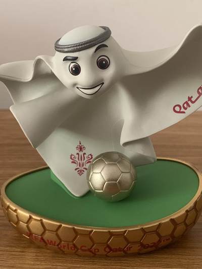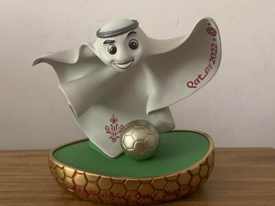 2022年卡塔尔世界杯官方吉祥物拉伊卜(La'eeb)手办。它造型源自阿拉伯传统服饰“ Gulf thobe”,形象灵动飘逸,寓意“技艺高超的球员”,底座与足球细节呼应世界杯主题。