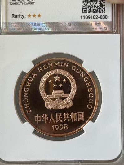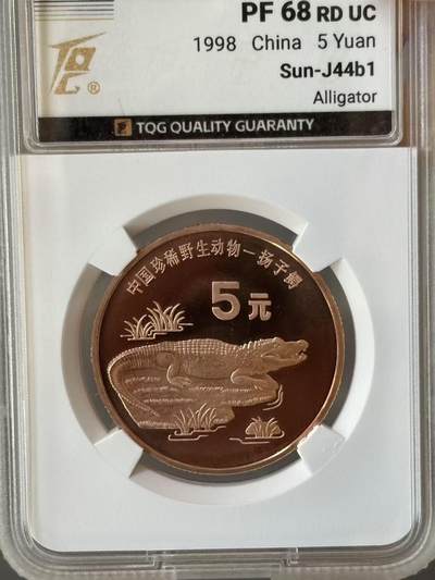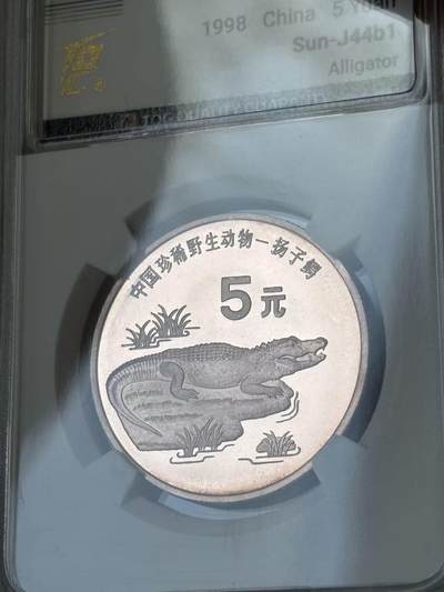 1998年中国珍稀野生动物—扬子鳄精制纪念币,面值5元,采用紫铜合金材质,直径32mm、重量13.5g,由沈阳造币厂铸造。普制币发行量600万枚,精制版仅装帧发行2万套。