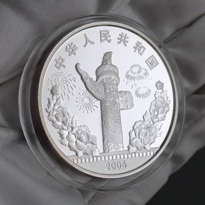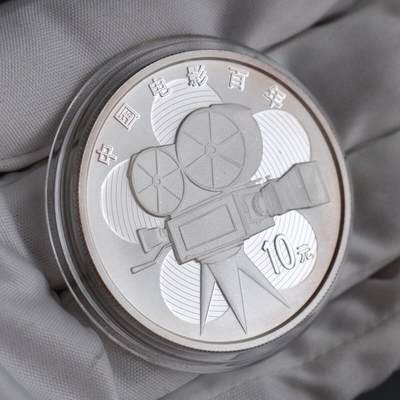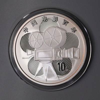 2005年中国电影诞生100周年1盎司纪念银币,面值10元。正面为华表、牡丹与烟花,背面是老式电影摄影机,是纪念中国电影百年的收藏佳品。