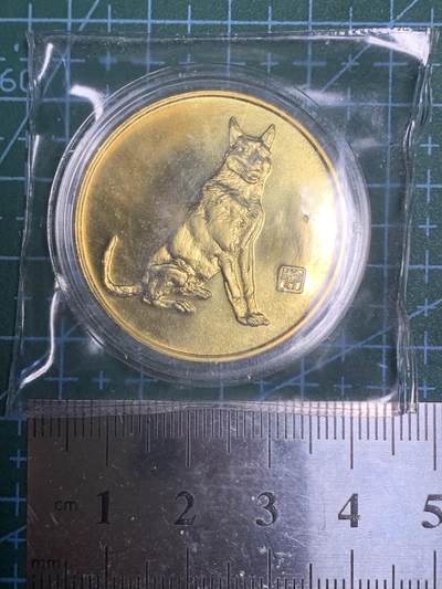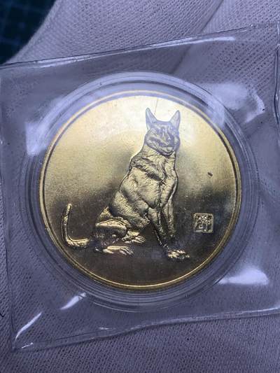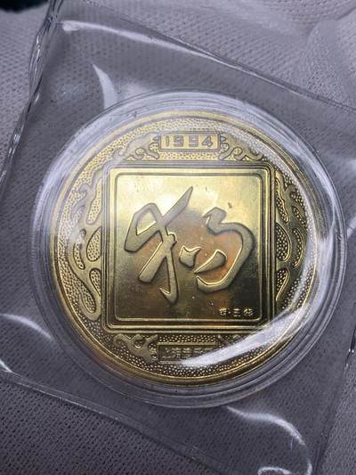 1994年狗年生肖纪念章,上海造币厂铸造,镀金材质。正面图案为一只坐姿犬,旁配有生肖印章式纹样;背面中心为方形“狗”字,上方标注1994年份,下方印有厂名,外圈环绕吉祥纹饰,整体设计规整,生肖特征鲜明。