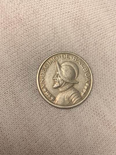 巴拿马1986年1/10巴波亚(1/10 Balboa)硬币,巴拿马共和国1986年发行。正面为巴斯库阿尼兹左侧像,环刻西班牙文面额;背面为巴拿马国徽,铜镍材质。