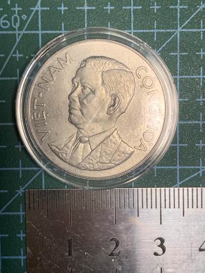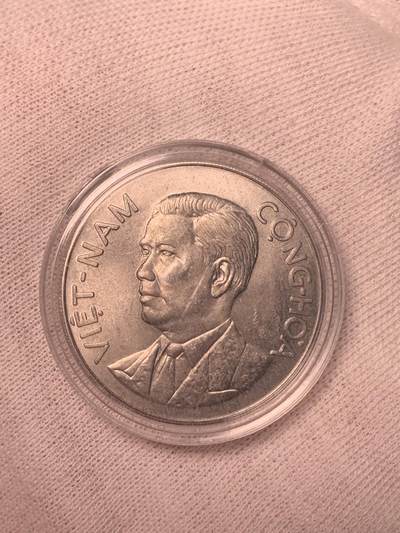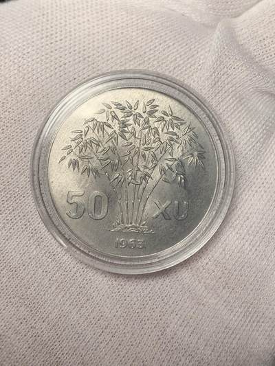 南越1963年50 Xu硬币 越南共和国1963年发行,面额50 Xu,铝质。正面竹子图案,背面为吴庭艳左侧头像及“VIỆT-NAM CỘNG-HÒA”(越南共和国)字样。