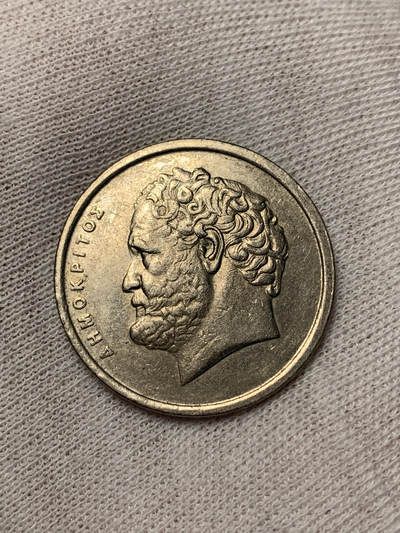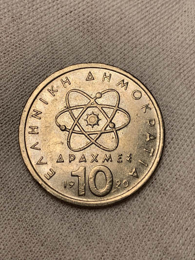 1990年希腊10德拉克马铜币,正面为古希腊哲学家德谟克利特,卷发与胡须刻画饱满,尽显智者风貌;背面是原子结构图案,呼应其原子论学说,象征对科学的探索精神。