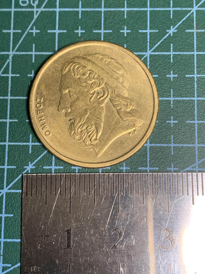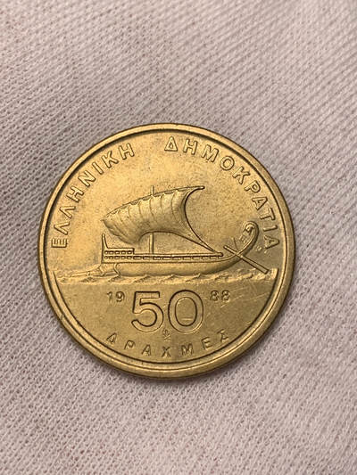 1988年希腊50德拉克马铜币,正面为盲诗人荷马,头戴头带,卷发与胡须刻画细腻;背面是古希腊三列桨战船,象征希腊航海文明。