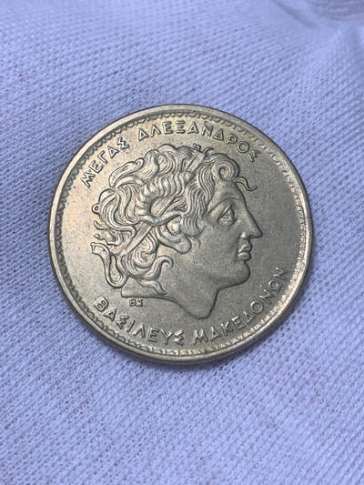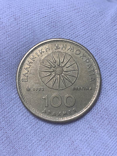 1992年希腊100德拉克马铜币,正面为马其顿国王亚历山大大帝,头戴象征神性的公羊角头带,卷发造型还原古典艺术风格;背面是源自马其顿王室墓葬的维吉纳太阳纹章,象征古希腊太阳崇拜与王权。