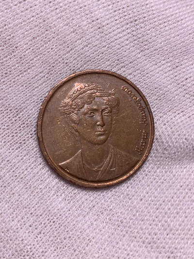 1988年希腊2德拉克马铜币,正面为诗人卡利马科斯,头戴花环,面容刻画温婉典雅;背面是船锚与舵轮组合,延续希腊航海文化符号。