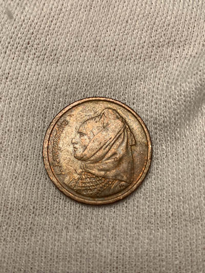 1988年希腊1德拉克马铜币,正面为头戴头巾的希腊传统女性形象,服饰纹理与头巾褶皱刻画细腻;背面是古典帆船图案,象征希腊航海传统。