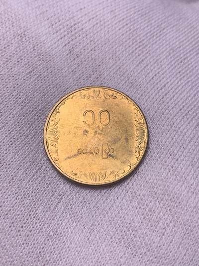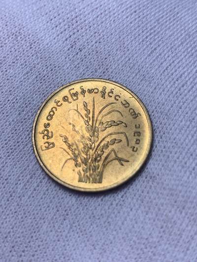 缅甸1975年发行50分FAO水稻流通币,正面阿拉伯数字“50”配缅文与卷草纹,背面稻穗寓意农业,黄铜材质,直径24.5mm,第四套流通币,存世量大,市价低廉。