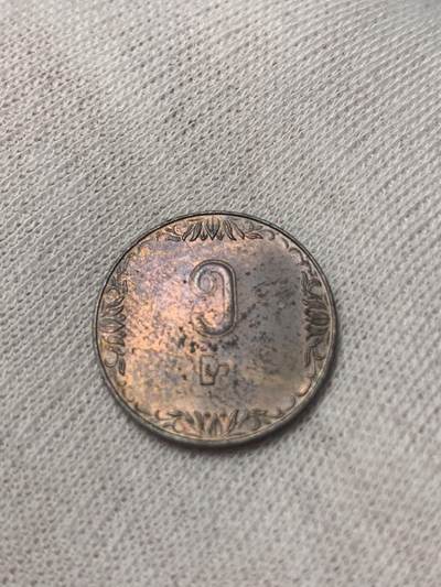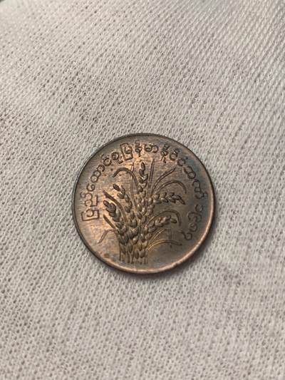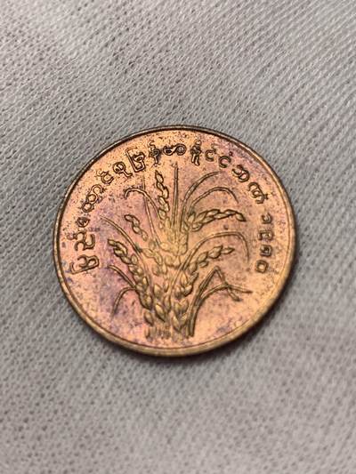 缅甸1975年发行1分FAO纪念币,正面缅文数字“1”配卷草纹边框,背面稻穗图案呼应粮食安全主题,红铜材质,直径18mm,属第四套流通币,存世量较大,收藏门槛低。