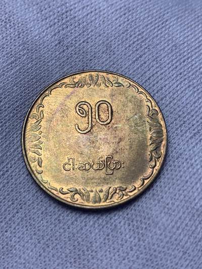 缅甸1975年发行10分FAO流通币,正面缅文数字“10”配卷草纹边框与“ဆယ်ပြား”字样,背面稻穗图案呼应粮食安全主题,黄铜材质,直径21mm,属第四套流通币。