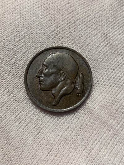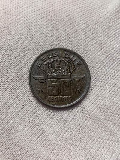1978年比利时发行的50生丁流通铜币,正面为戴头盔的男性侧面头像,右侧配有炮管图案;背面是比利时王冠与面值“50 CENTIMES”,标注国名“BELGIQUE”,材质为铜锌合金。