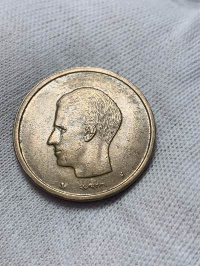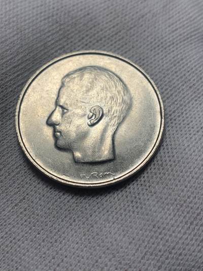 1977年比利时发行的10法郎流通镍币,正面为博杜安一世国王左侧头像,由设计师Harry Elstrom创作;背面是比利时国徽,标注面值“10F”与国名“BELGIQUE”。材质为纯镍,直径27毫米,重8克。