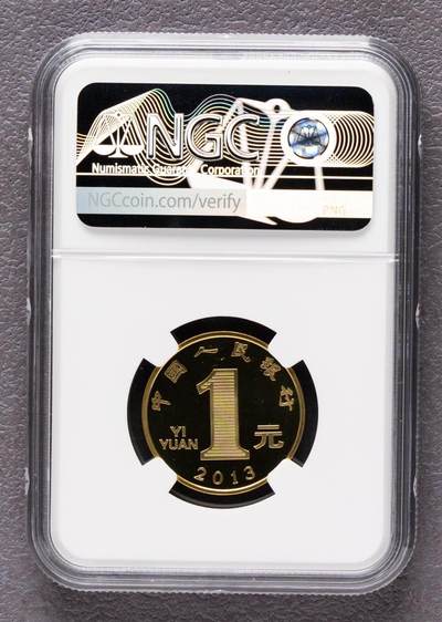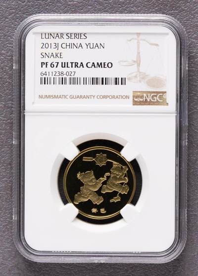 - 发行年份:2013年(癸巳蛇年) - 面值:1元 - 材质:黄铜合金 - 规格:直径25mm,重量6.75g - 工艺:精制版(Proof),发行量仅8万枚,普制币发行量8000万枚,精制版存世量极少 - 评级信息:NGC PF67 Ultra Cameo - PF67:精制状态,图案完整、浮雕清晰,仅存在极轻微的肉眼不可见瑕疵 - Ultra Cameo(UC):顶级精制工艺特征,底板呈现高镜面光泽,浮雕与底板形成强烈黑白反差,立体感极强