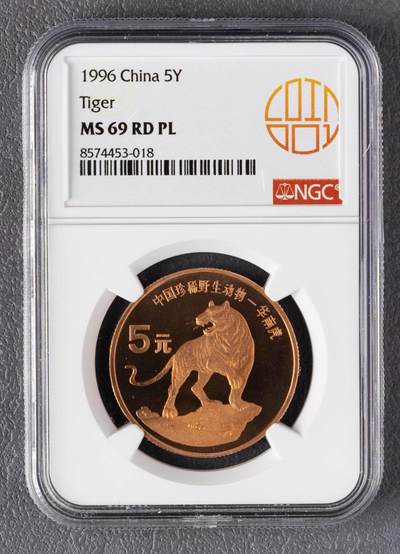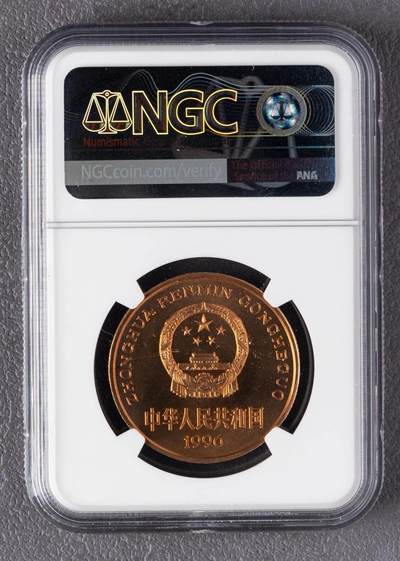 - 发行年份:1996年 - 面值:5元 - 材质:紫铜合金 - 规格:直径32mm,重量13.5g - 工艺:精制版(Proof-like),装帧量约2万枚,远少于普制币的600万枚 - 评级信息:NGC MS69 RD PL - MS69:未流通状态,品相近乎完美,仅存在极微小瑕疵 - RD:全红铜色,氧化程度极低 - PL:类精制镜面,底板光泽感强