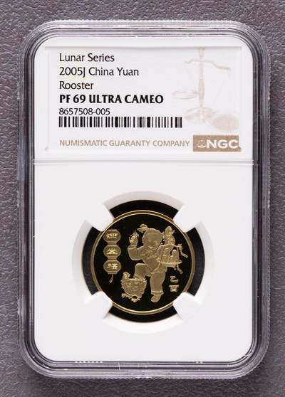 - 发行年份:2005年(乙酉鸡年) - 面值:1元 - 材质:黄铜合金 - 规格:直径25mm,重量6.75g - 工艺:精制版(Proof),发行量仅10万枚,远少于普制币的1000万枚 - 评级信息:NGC PF69 Ultra Cameo - PF69:精制状态,近乎完美,仅存在极微小瑕疵 - Ultra Cameo:深浮雕与镜面底板形成强烈反差,浮雕部分呈霜白色,底板如镜面般光亮
