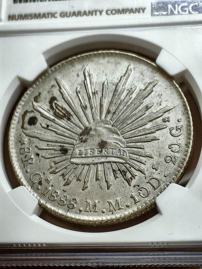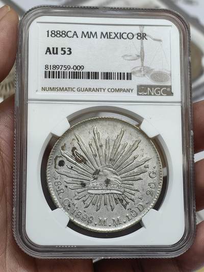 - 基本信息:直径39毫米,重量27.07克,含银量约90.30%。 - 图案设计:正面是一张翅雄鹰,嘴叼长蛇,单腿立在仙人掌上,边缘上方书西班牙文“REPUBLICA MEXICANA”,即墨西哥共和国。背面主图中央为一顶自由软帽,帽周围放射长短不一的32枝光柱,代表墨西哥全国31个州和1个联邦区。边缘下半方分别铸有装饰“五角星”“8R”(面值)、字母(造币厂标识)、“1888”(铸造年份)等。 - 铸造厂标识:不同铸造厂有不同标识,如“D”“M”等,这些标识会标示在银元上。例如,一枚背面文字标注为“8R·D·1888·M·C·10D·20G”的鹰洋,“D”就是铸造厂标识,“M.C”是批量检验师名称的缩写,“10D”“20G”等符号则为含银量、重量的标准量。 - 流通情况:墨西哥花边鹰洋在1840年前就流入中国,1857年起逐渐成为南方市场主流。1888年发行的鹰洋也大量流入中国,在当时的贸易往来中被广泛使用。