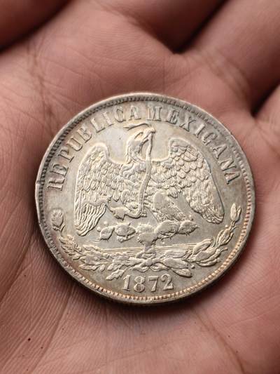 1872年墨西哥天平鹰洋常见的面值为1比索,重量约26.8克-26.93克,直径在37毫米左右,成色为90.3%左右。其正面图案为展翅雄鹰,嘴叼长蛇,单腿立在仙人掌上,边缘上方书西班牙文“REPUBLICA MEXICANA”(墨西哥共和国);背面上方为一顶光芒四射的自由软帽,帽檐书有“LIBERTAD”(自由)字样,帽下为均衡天平,中间是法律文件,文件上刻阴文“LEY”(法律),后斜置利剑,边缘书“UN PESO”(1比索)等