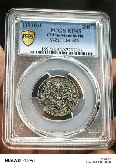 - 发行:1909-1915年,奉天造币厂(东三省银元总局);面额二角(库平一钱四分四厘),非流通主币,东北民间主力辅币 - 规格:90%银(宣统二年起降为约80%);重量5.2-5.4g;直径约23mm;厚度约1.3mm - 图案:正面珠圈“宣统元宝”,中心满文,上“东三省造”、下“库平一钱四分四厘”,两侧花星;背面坐龙(龙纹分毛角/鹿角龙等),环英文“MANCHURIAN PROVINCES”