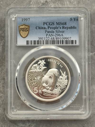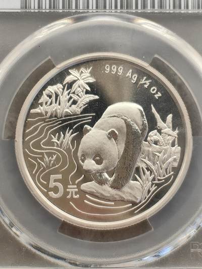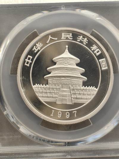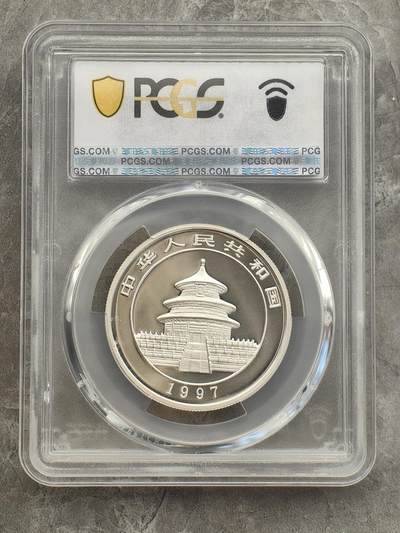 - 发行/铸造:中国人民银行;上海造币厂;1997年,普制/精制并行,属贵金属纪念币(非流通) - 面额:5元;材质:999纯银;重量:1/2盎司(15.55克);直径32.5mm;厚度2.2mm - 图案:正面天坛祈年殿、国名、年号;背面熊猫溪边休憩(当年专属设计,无重复) - 发行量:普制10万枚;彩色精制10万枚;另有香港钱币展纪念版3万枚