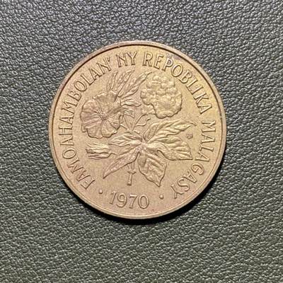 中央是马达加斯加本土的花卉植物组合,包括木槿、咖啡花等,象征该国丰富的植物资源。币缘环绕马尔加什语“FAMOAHAMBOLAN' NY REPOBLIKA MALAGASY”,意为“马达加斯加共和国团结”,并标注发行年份“1970”。