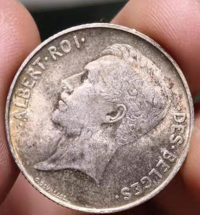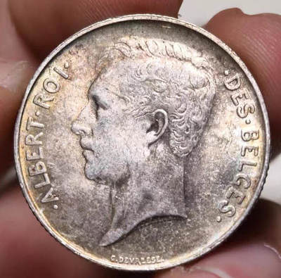 UNC未流通的品相 比利时王国阿尔伯特一世1法郎银币 整体金绿色包浆 包浆细节都好 打算送评大家猜猜看能出多少分呢?