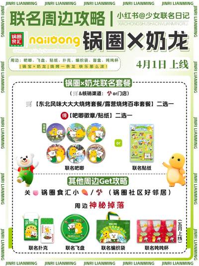 传下去!锅圈食汇×奶龙juju可爱‼️ 🦖前方萌物来袭! 春天露营烧烤选择锅圈食汇真的是超省心的选择 而且搭配上超萌的奶龙周边, 简直春日露营气氛拉满! . ⏰时间:4月1日上线 . 【周边小细节】 →飞盘:超适合春日露营朋友们一起运动起来! →编制袋:可爱奶龙印花,露营装食材超合适 →扑克牌:活跃气氛必备道具,多种玩法都可以 →奶龙主题贴纸:超多小细节,无论用来做手帐记录生活还是随意贴都超可爱 →吧唧盲盒:5+1配置,看看大家的实力怎么样 . 【奶龙套餐】 ✅东北⻛味⼤⼤⼤烧烤套餐(3-4⼈餐):大串自带东北豪放气质,主打一整个肉大、份量大!适合想要大口吃肉的宝子,尊嘟过瘾呐~ ✅露营烧烤百串套餐(3-4⼈):99元到⼿14件,种类齐全,适合想要多种尝试的宝子,全安排,不⽤挑不⽤配,轻松实现烧烤⾃由 两种套餐轻松Get奶龙周边吧唧徽章或贴纸哦~ 把萌趣带回家! · 想集齐更多好物?记得guan🐷锅圈食汇的🍠&🫘官号 [鼓掌R]还有神秘周边随机掉落哦~ 联名飞盘、编织袋、扑克牌、吨吨杯都是春日出游氛围感好物! 大好天气不辜负,这次联名锅圈🈵满心意💕~