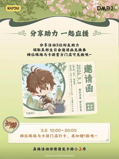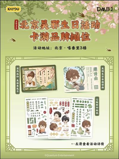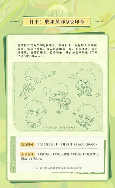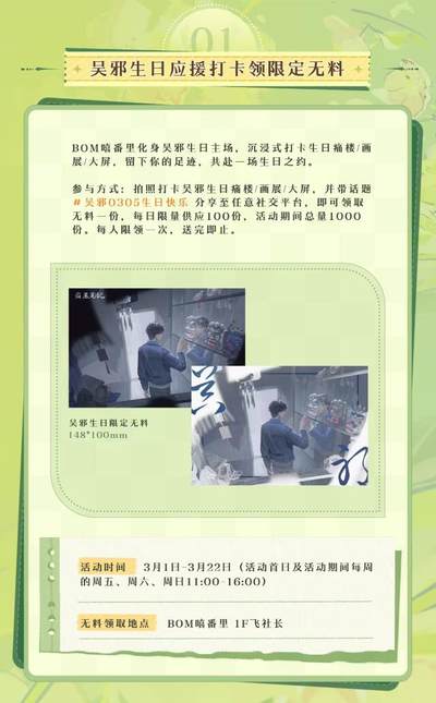速报!在北京的稻米们集合啦🔥 吴邪生日主题快闪3月1日起空降嘻番里‼️限定无料+打卡集章+新品快闪,现场惊喜不断🥰!从3月1日到3月22日整整三周,每周都精彩,就等你啦! 🎁 吴邪生日限定无料免费领! 官方大家准备了吴邪生日限定无料!每日限量100份,活动期间总计1000份,每人限领一次。记得定好闹钟⏰,早早来蹲守哦! 📆活动时间:活动首日及活动期间每周五六日11-16点派发 📍领取地点:BOM嘻番里 1F入口处 🏃 打卡集章,解锁吴邪Q版印章! 前往指定的五家店铺:南漫社、次元书馆、谷池、鲸喜次元商店、飞社长。完成店铺的打卡任务后就能盖上吴邪Q版印章啦❗记得要按顺序排队,每人每次限盖一枚,多盖请重新排队,爱护印章轻拿轻放哦~ 📅:3月1日起 先到先得,发完即止 🛍️ 官方快闪店,买买买还有超值赠品! 重头戏来啦!吴邪生日官方快闪店开张,众多生日新品限时上线!而且购买就有丰厚赠品相送,买得越多送得越嗨! 赠品规则一览(所有赠品送完即止): ·买就送:云游笔迹mini吧唧-吴邪款1个(限量6000个) ·满50元:加赠吴邪生日限定烬羽纸袋1个(限量5000个) ·满100元:再加赠寒燕渡春光栅卡1张(限量3000个) ·满150元:继续加赠云游笔迹mini立牌-吴款1个(限量2000个) ·满200元:终极加赠寒燕渡春拍立得套组1件(限量3500个) ❗重要提示❗ 每人每次排队仅可结账一次,结账不可拆单哦~同订单赠品可叠加,不同小票之间不可叠加💓 📅:3月1-22日 10:30-21:00 🔮 品牌主题市集 每周末将开启品牌主题市集(具体品牌阵容即将揭晓),更多趣味和好物等你来发掘!一站式不用转场,全部将你喜欢的柄图抱回家~🏠 📅:周末开放 这个春天,相约嘻番里,和吴邪一起解锁春日心动✨,度过一个难忘的3月吧~等你来high! #BOM嘻番里 #嘻番里 #吴邪 #稻米 #吴邪生日 #吴邪周边 #盗墓笔记 #盗墓笔记周边 #盗墓笔记系列 #吴邪生贺