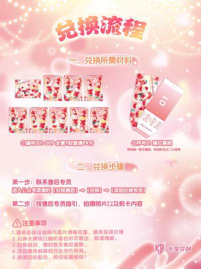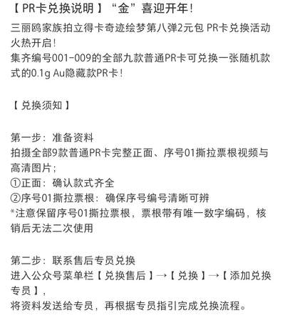 三丽鸥家族拍立得卡奇迹绘梦第八弹2元包 PR卡兑换活动火热开启! 集齐编号001-009的全部九款普通PR卡可兑换一张随机款式的0.1g Au隐藏款PR卡! 【兑换须知】 第一步:准备资料 拍摄全部9款普通PR卡完整正面、序号01撕拉票根视频与高清图片; ①正面:确认款式齐全 ②序号01撕拉票根:确保序号编号清晰可辨 *注意保留序号01撕拉票根,票根带有唯一数字编码,核销后无法二次使用 第二步:联系售后专员兑换 进入公众号菜单栏【兑换售后】→【兑换】→【添加兑换专员】, 将资料发送给专员,再根据专员指引完成兑换流程。 ⚠️注意事项 1.请务必保证视频与图片清晰完整,避免延误处理 2.兑换卡牌将以随机盲包形式寄出,敬请理解。 3.如有疑问,随时联系售后客服。 4.感谢您的配合,祝您收藏愉快! *活动最终解释权归主办方所有 祝大家 “金”喜迎开年,好运“马”上有! #三丽鸥 #卡宝文创 #兑换 #黄金