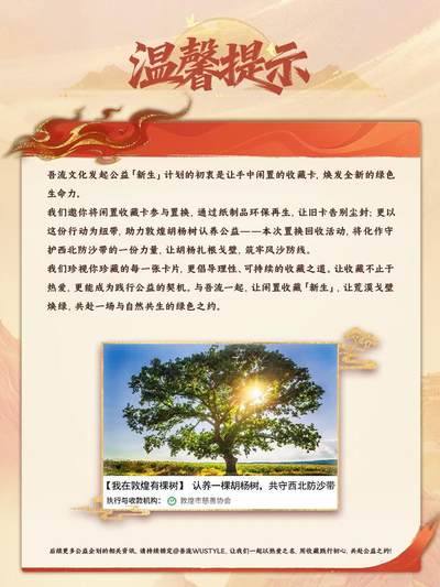 情报|「吾流·新生」公益企划第2期活动规则 每一张公益卡的兑换,都将转化为养护胡杨树的力量,让胡杨林成为守护西北荒漠的卫士。 这一场热烈的追剧体验,将成为胡杨树蓬勃生长的枝叶,长久地扎根于西北荒漠,带来活力与生机~ 凡购买「入青云·每日都甚好」主题收藏卡-余音系列的用户,均可参与本次敦煌胡杨林植树公益企划,兑换限量专属公益兑换卡。 【吾流WUSTYLE抽卡机】 活动时间:2026.02.26-2026.03.16 抽卡机兑换卡提交发货截止时间:2026.05.01 00:00 兑换规则:抽卡机用户每次可选择暂存柜中的 200 张「入青云·每日都甚好」主题收藏卡-余音系列(注:限编卡牌无法参与)兑换1张本次活动专属的公益兑换卡(共 2 款,每兑换 1 次可随机获得 2款中的 1 款,不可指定卡面获取)。 ❗❗公益兑换卡为非卖品,数量有限,先到先得,兑完即止 【直播间】 活动时间:2026.03.01 — 2026.04.30 兑换规则:直播间用户可消耗300张「入青云·每日都甚好」主题收藏卡-余音系列(注:不建议使用限编卡),兑换1张本次活动专属的公益兑换卡(共2款,卡面款式、卡背编号随机)。 ❗❗公益兑换卡为非卖品,数量有限,先到先得,兑完即止 吾流文化发起公益「新生」计划的初衷,是让手中闲置的收藏卡,焕发全新的绿色生命力。 我们邀你将闲置收藏卡参与置换,通过纸制品环保再生,让旧卡告别尘封;更以这份行动为纽带,助力敦煌胡杨树植树认养公益—— 本次置换回收活动,将化作守护西北防沙带的一份力量,让胡杨扎根戈壁,筑牢风沙防线。 我们珍视你珍藏的每一张卡片,更倡导理性、可持续的收藏之道。让收藏不止于热爱,更能成为践行公益的契机。与吾流一起,让闲置收藏「新生」,让荒漠戈壁焕绿,共赴一场与自然共生的绿色之约。 后续更多公益企划的相关资讯,请持续锁定@吾流WUSTYLE ,让我们一起以热爱之名,用收藏践行初心,共赴公益之约! 吾流官方旗舰店用户可联系客服获取兑换方式 具体活动细则详见各渠道公告,本活动解释权归吾流WUSTYLE所有。 #入青云 #侯明昊 #纪伯宰 #卢昱晓 #明意 #入青云每日都甚好收藏卡共谱续章 #吾流好剧存档计划 #吾流新生公益企划