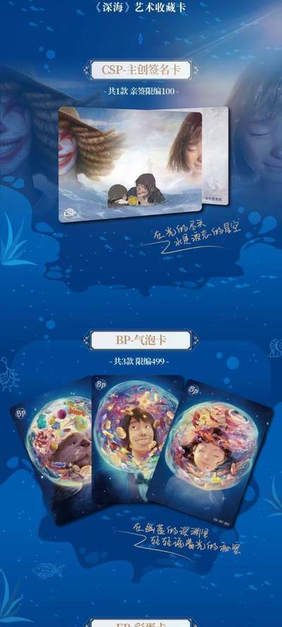 万漫社&深海收藏卡收单 ✨ 万漫社✖️ 十月文化电影《深海》联动来袭 《深海》主题画师艺术收藏卡牌‬即将发售! ✨ 🌊【颠覆想象的粒子水墨世界风卡牌,都是流淌的东方美学】 🌊【 原创画师&IP的双向赋能,彼此成就】 🌊【棍子、杨杰、vikki等一众画师突破自我 幻化深海 】 集220种卡牌之精粹 设23个卡位之巧思 让每一份收藏都有温度 让我们即刻前往那个光怪陆离的世界吧! -------------------------- 产品规格:10包/盒,36盒/箱 小黄零车‬售控价:100/盒 -------------------------- 🐚 每一箱必出四款‬赏品 🌊深海金属珐琅 深海的故事,在金属与珐琅的交融中,静静诉说,缓缓流淌 📖深海主题卡册 超200种卡牌的绚烂,是深海的万千姿态 🎬亚克力流沙票根 拾起票根,留住梦 以透明为海,以流沙为浪 🎐深海粒子拼图 我们把电影里的每一帧温柔与震撼,都藏进这片拼图的方寸之间 💙 每两箱必出 艺术毯 让这方承载着深海诗意与电影温度的艺术毯,为生活铺就一片永不落幕的蓝 🌌 每四箱必出 亚克力色纸装裱画 我们以电影为灵感,以艺术为笔触,将深海的光影、角色的羁绊、故事的余温,都封存在这幅亚克力色纸装裱画里