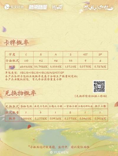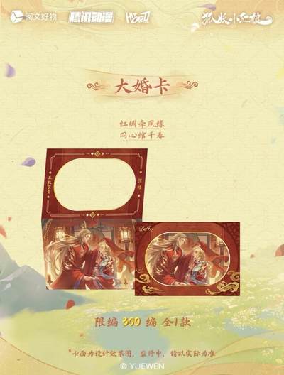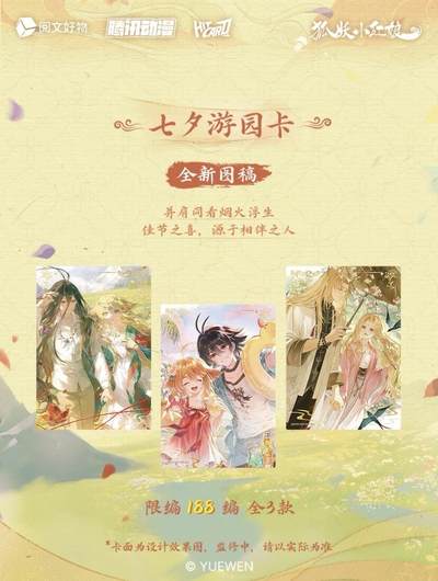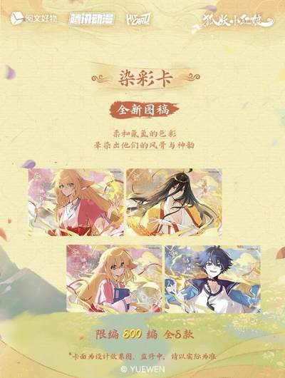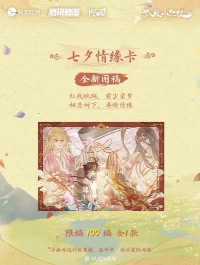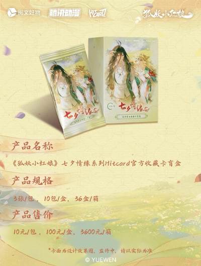 新品丨《狐妖小红娘》七夕情缘系列收藏卡 今生执手,七夕共牵❤️ 阅文好物 × Hitcard 联合出品《狐妖小红娘》七夕情缘系列Hitcard官方收藏卡盲盒💗 《狐妖小红娘》漫画作者小新老师亲笔签字卡敬上! 相思如红线,千年之夙愿终得相守,七夕情缘卡再续情缘; 红绸为证,共绾同心,大婚卡守护此生不变的深情誓言; 苦情树下,情丝缠绕,牵线折页卡将两颗心紧密相连; 兑换物:签绘色纸、亚克力色纸、主题吧唧礼盒、插卡立牌、主题大卡册、一官格卡册 【产品规格】 名称:《狐妖小红娘》七夕情缘系列Hitcard官方收藏卡盲盒 规格:3张/包,10包/盒,36盒/箱 价格:10元/包,100元/盒