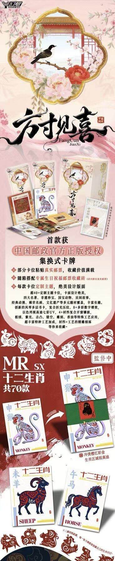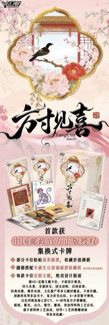 中国邮政幻熠《方寸见喜典藏收藏卡》明首拆 首款获中国邮政官方正版授权集换式卡牌;经典邮票换新颜,收藏价值感满载 四大名著、非遗珍宝、国宝动物、民间故事、经典动漫、稀世名画、文化遗产等多元题材覆盖,丰富有趣 传统文化与新潮设计融合,绝版真实邮票与全新卡牌工艺结合,上个世纪经典与当代前沿技术。 藏华夏之美,映方寸之间。以邮为媒,凝华夏之美,借卡为介,传方寸之喜 产品规格: 2张/包,13包/盒,24盒/箱。 168元/盒 发货时间:2月3号发货(先发偏远)按照订单顺序开始发货(跨越/顺丰定点配送),5号全网首拆。 ——————————— 产品亮点: 全系列40余款卡种,近400张不同的卡面设计,邀您共赏邮票及工艺之美。 【超珍贵正版邮票掉落】 80年首版超绝猴票与26年新年贺岁马票同在,产品含超珍贵邮票随机掉落加持 【国宝级艺术作品荟萃】 清明上河图、韩熙载夜宴图、齐白石等传世名作真实邮票镶嵌 【世界级文化遗产奠基】 故宫博物院、万里长城、兵马俑等邮票主题与产品设计深度结合 创新工艺呈现: 风琴多层书卡,折光压纹、多彩数字增效,视高迪七彩UV,4+材料复合开窗镶嵌,植绒、紫光、击凸、镂空、雕刻、香油等特殊工艺应用,超丰富特种工艺加成,材料+工艺的精雕细琢
