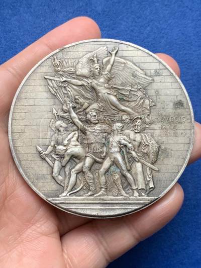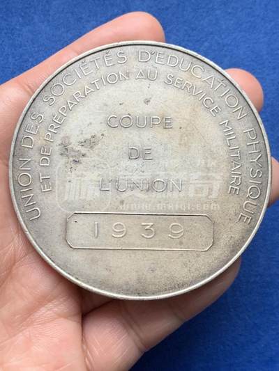 法国1939年军事体育联盟纪念银章,复刻吕德《马赛曲》浮雕,正面高浮雕还原胜利女神与战士群像,背面刊刻联盟名称及“联盟杯1939”字样。
