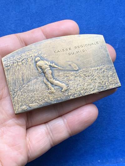法国南部地区农业储蓄银行异形铜章,扇形形制,正面浮雕牛耕场景,细节写实;背面刻镰刀收割场景及“CAISSE RÉGIONALE DU MIDI”字样,记录法国南部农业风貌与金融机构历史。