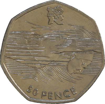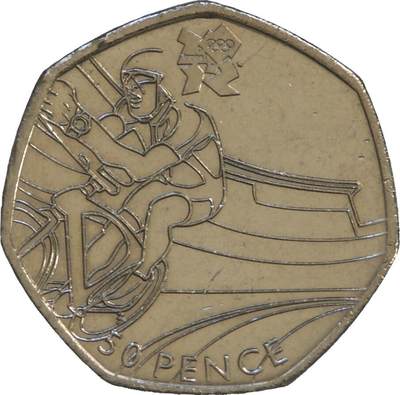 - 核心图案:币面主体为场地自行车运动员在赛道上冲刺的动态造型,用流畅线条还原了骑行发力的姿态,背景线条模拟了自行车馆的赛道轮廓,极具速度感;币面上方是2012伦敦奥运会官方会徽,下方标注面额“50 PENCE”。